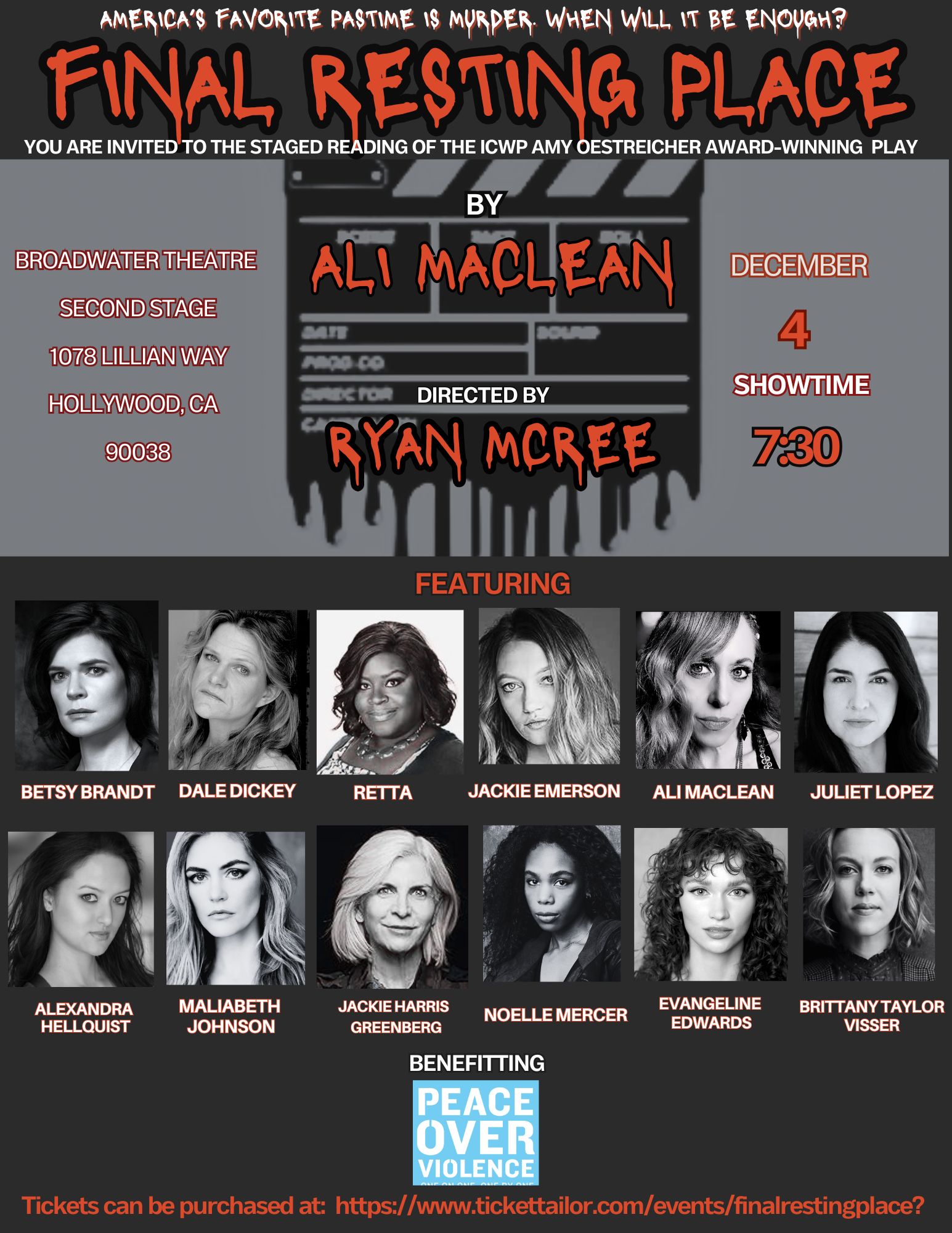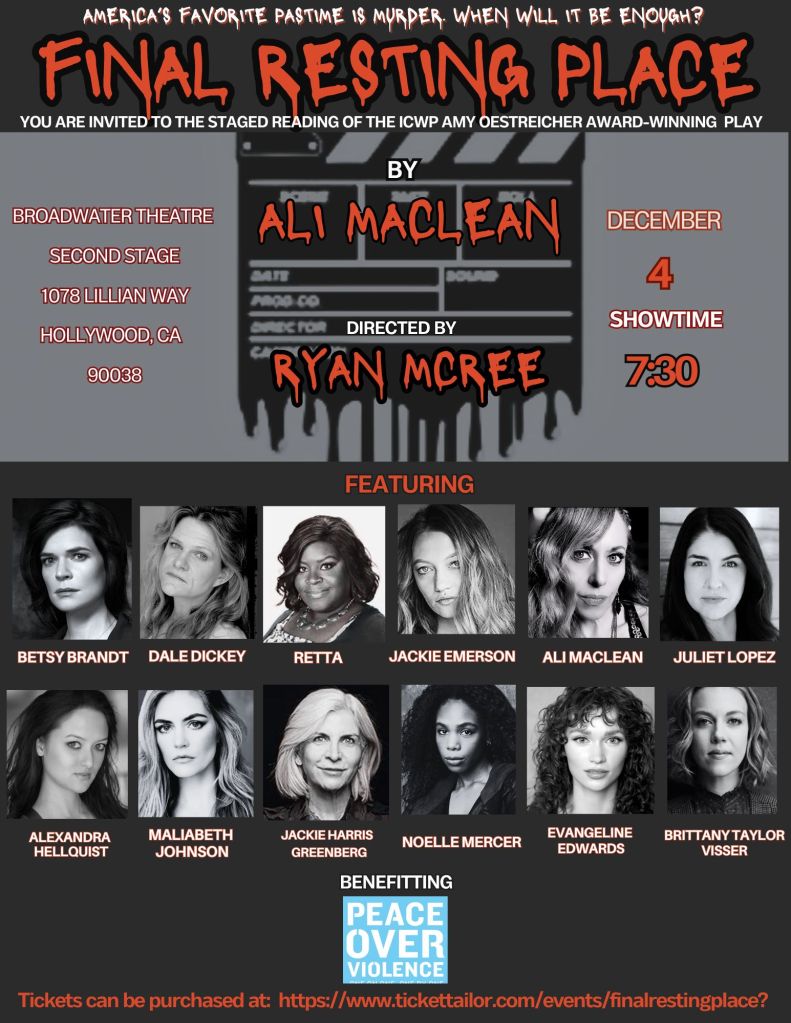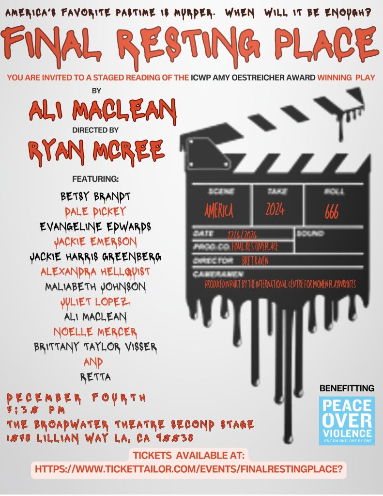 Final Resting Place will be performed at the Broadwater Theater Second Stage on Wednesday, December 4th at 7:30pm. MacLean’s play, which is the winner of the International Centre for Women Playwrights Amy Oestreicher Award, will be read as a benefit for the non-profit Peace Over Violence.