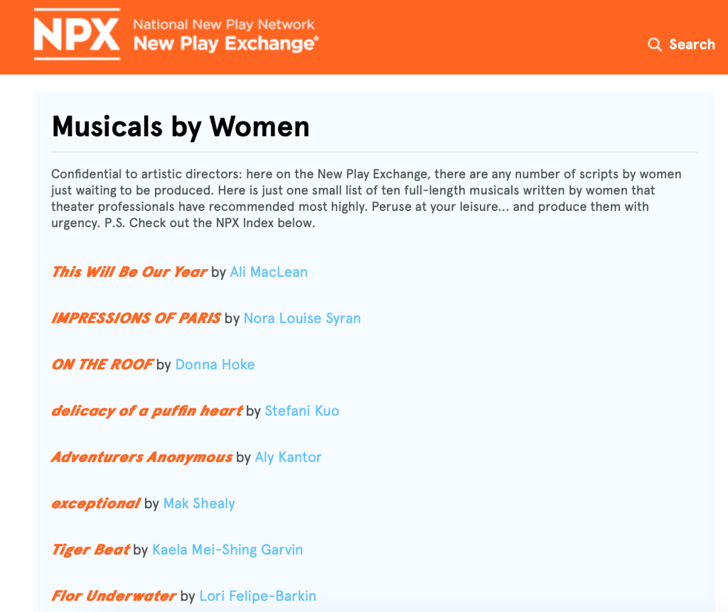 Confidential to artistic directors: here on the New Play Exchange, there are any number of scripts by women just waiting to be produced. Here is just one small list of ten full-length musicals written by women that theater professionals have recommended most highly. Peruse at your leisure… and produce them with urgency. P.S. Check out the NPX Index below.