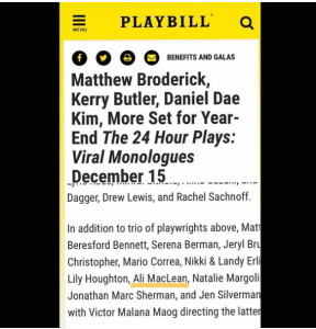 She participated in the 24 Hour Plays Viral Monologues alongside Kenneth Lonergan and Matthew Broderick, writing for Broadway star Kerry Butler.